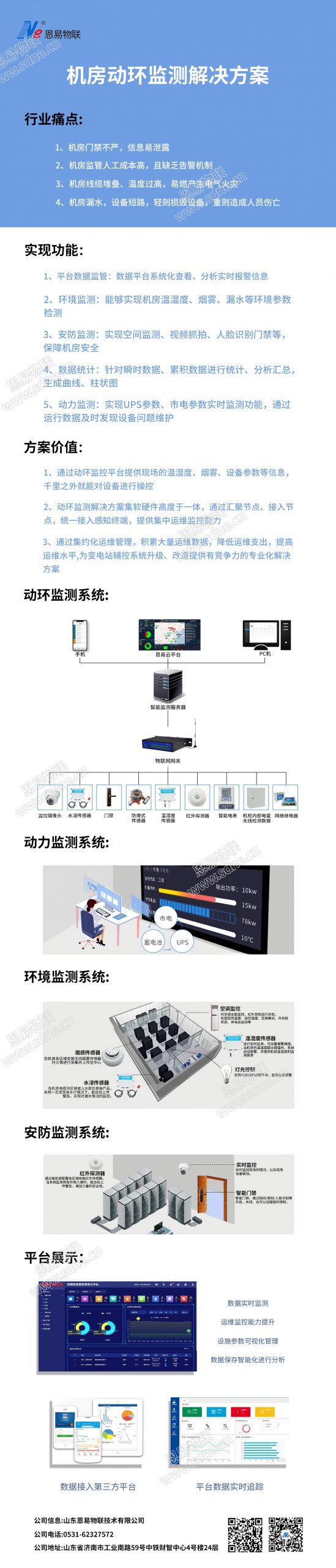 机房动环监测解决方案 物联网应用技术 | 2021年10月29日 | 物联网应用解决方案 恩易物联机房动环监测解决方案可实现 1、平台数据监管:数据平台系统化查看、分析实时报警信息 2、环境监测:能够实现机房温湿度、烟雾、漏水等环境参数检测 3、安防监测:实现空间监测、视频抓拍、人脸识别门禁等,保障机房安全 4、数据统计:针对瞬时数据、累积数据进行统计、分析汇总,生成曲线、柱状图 5、动力监测:实现UPS参数、市电参数实时监测功能,通过运行数据及时发现设备问题维护 想要了解更多解决方案,欢迎拨打:0531-62327572。
